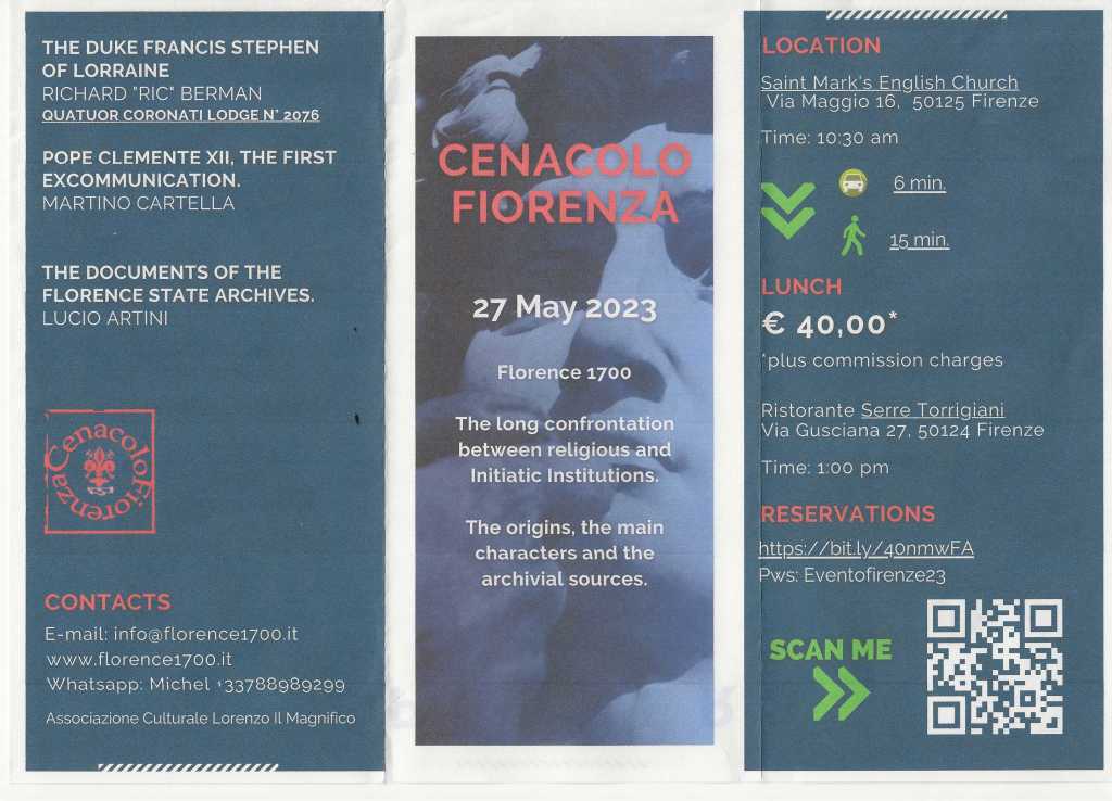 Conference on Italian Freemasonry in Florence on 27th May 2023 May 8, 2023 · by certes_pg · in News. · Interesting Conference Organized by CIRCOLO FIORENZA See the leaflet program herewith. If you wish to attend you can book directly. Share this:Tweet Email a link to a friend (Opens in new window) Email Print (Opens in new window) Print More Share on Reddit (Opens in new window) Reddit Share on TumblrLike Loading... Related