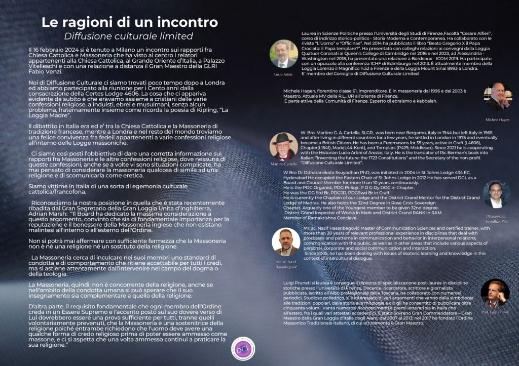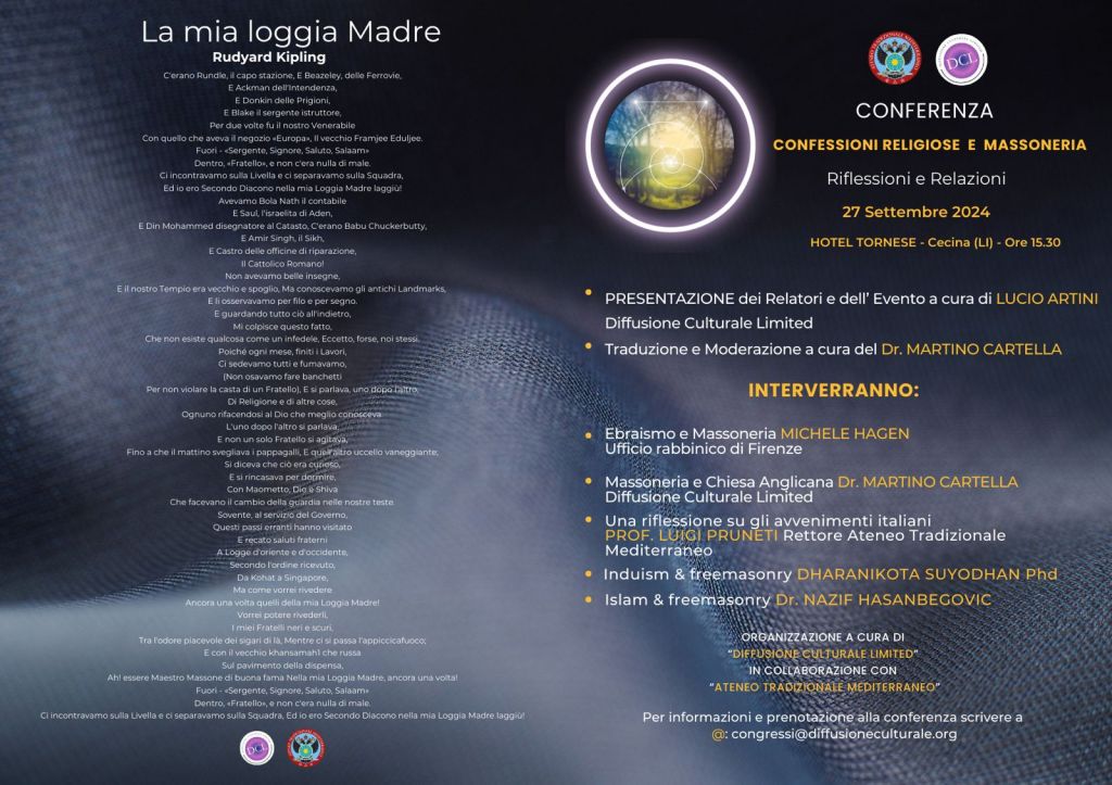 On 27 September 2024 at Hotel Torinese in Cecina (LI) ITALY (3:30 p.m.) Diffusione Culturale in collaboration with Ateneo Tradizionale Mediterraneo will held a conference on “Confessioni religiose e Massoneria” (Religious confessions and Freemasonry).